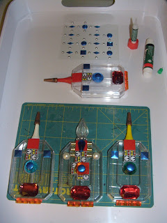 So, the plastic golf tees are also from Daiso ($1.50 for a bag, and they make handy cannon barrels among other uses sci-fi!), while the odd bits in the small plastic box are assorted plastic beads, barrel clasps for making earrings from the craft store, some cheap plastic Christmas decorations from the local Diddams party supply store, and other odds and ends I've accumulated over the years (waste not, want not!).